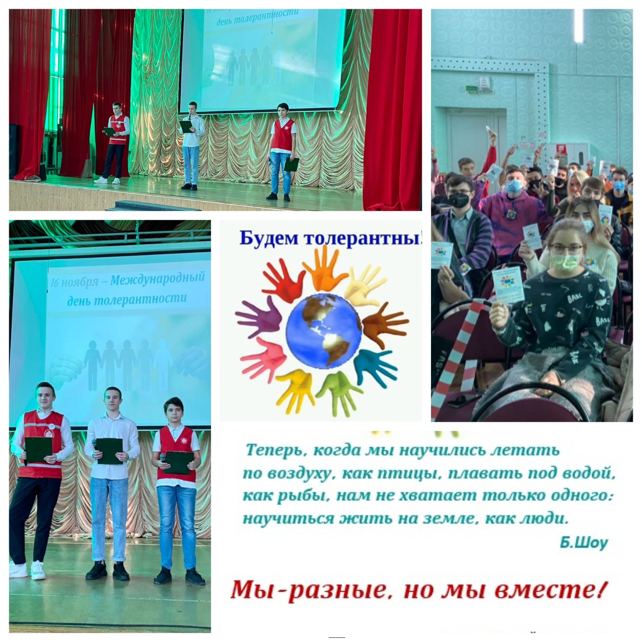 В колледже отметили день толерантности. Собравшимся в актовом зале прикрепляли символические «цветы толерантности» и раздавали листовки. Прозвучали стихи о толерантности и Гимн демократической молодежи мира. Кроме того, студенты узнали об истории праздника и почему нетерпимость – одна из основных угроз современному обществу.
