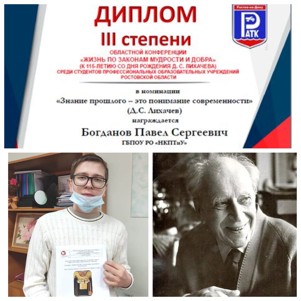 В номинации «Знание прошлого – это понимание современности» (Д.С. Лихачёв) третье место занял студент группы ИС-201 Павел Богданов (руководитель Иванова Е.В.). На конференции он представил свою исследовательскую работу «Русская культура – открытая культура, добрая и смелая».