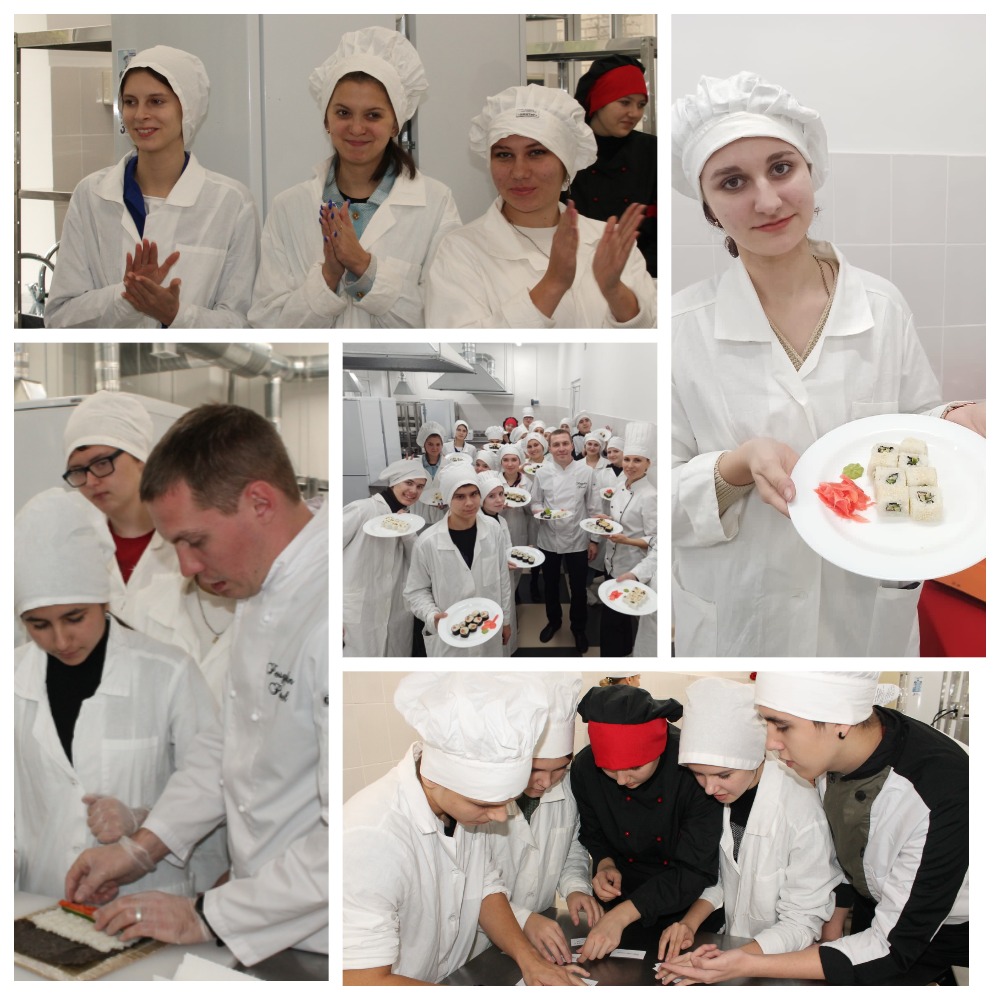 После викторины мастер производственного обучения Павел Посыпкин рассказал и показал ребятам различные виды приготовления суши и роллов. Павел Павлович поделился со студентами лайфхаками в технологии приготовления блюд японской кухни.