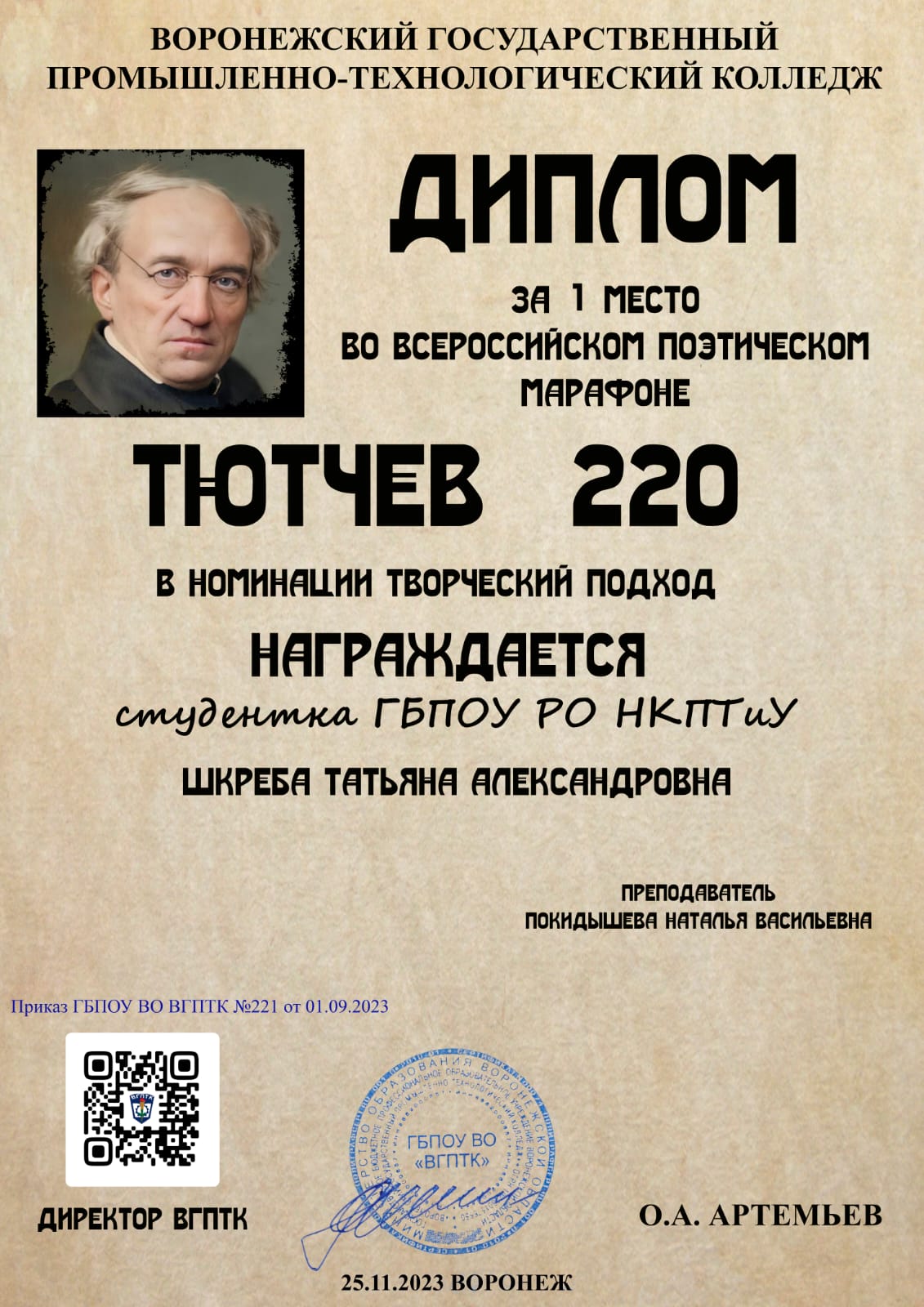 С 7 сентября по 25 ноября в Воронежском государственно-промышленном технологическом колледже проходил поэтический марафон «Тютчев-220», посвященный 220-летию со дня рождения поэта Фёдора Тютчева.