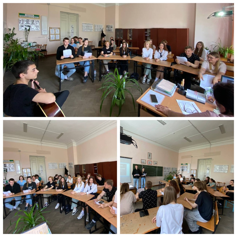 А также просмотрели отрывок из кинофильма «Белорусский вокзал», где герои исполнили песню «Нам нужна одна победа». На мероприятии царила тёплая и дружеская атмосфера. В конце ребята все вместе спели песню «Давайте восклицать...».