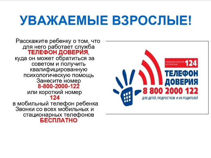 Телефон доверия доступен круглосуточно и бесплатно по всей стране: 8-800-2000-122 и короткий номер 124 (для звонков с мобильного телефона).