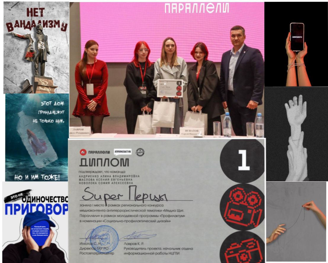Команда из трех студенток Софии Наволока, Алины Андриенко и Ксении Масловой Новочеркасского колледжа промышленных технологий и управления под названием «Super Перцы» заняла 1 место в рамках молодежной программы «Профилактум» в номинации «Социально-профилактический дизайн».