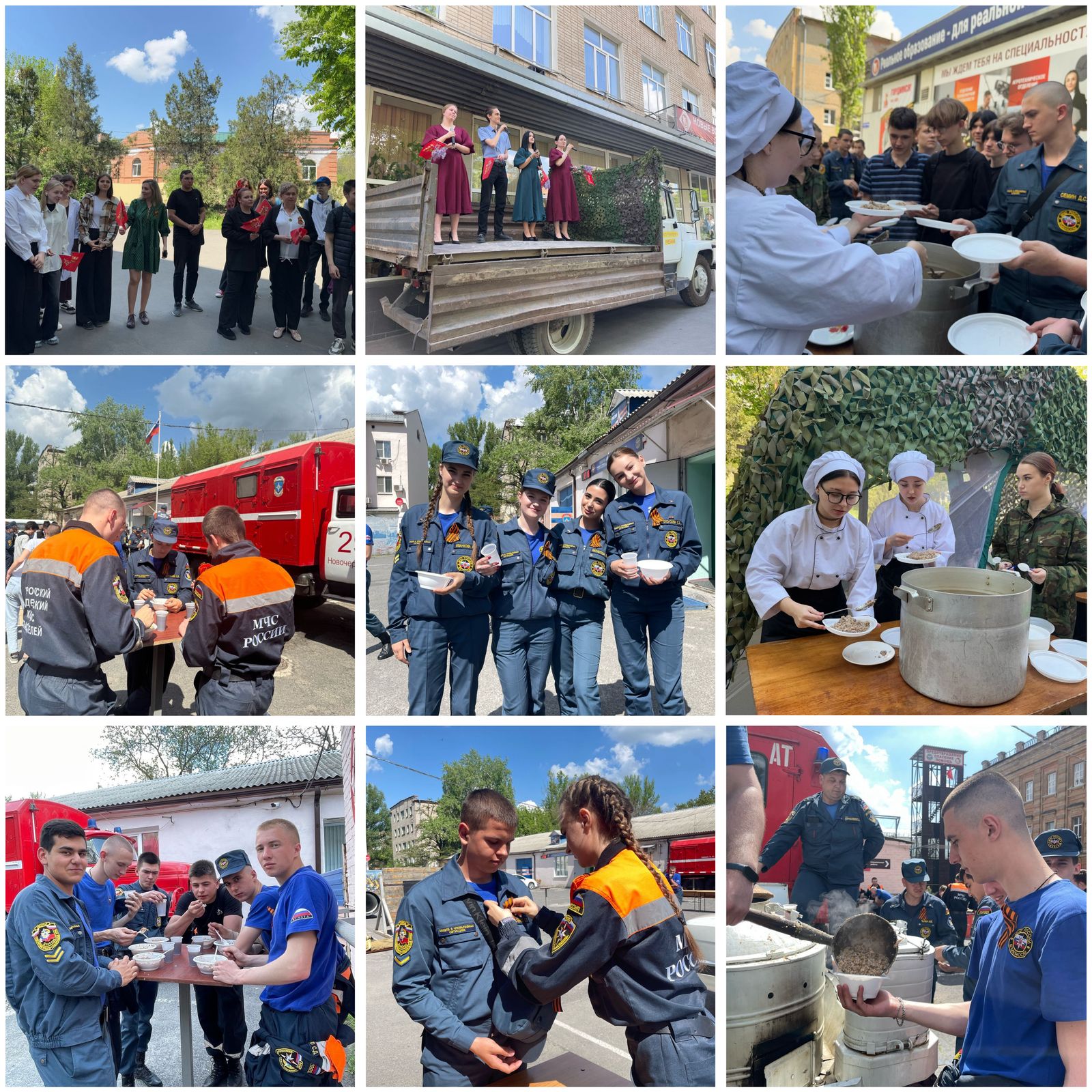 В Новочеркасском колледже промышленных технологий и управления на большой перемене была организована «Полевая кухня», которая угощала студентов и преподавателей обеденной кашей, которую ели участники Великой Отечественной войны.