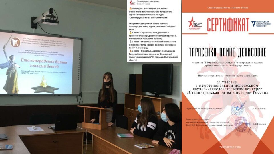 23-24 октября 2020 года в течение двух дней участники очного этапа межрегионального молодежного научно-исследовательского конкурса «Сталинградская битва в истории России» выступали с защитой своих проектов. Данный этап проходил в формате онлайн. Участниками конкурса стали молодые исследователи из Волгоградской, Астраханской, Тамбовской, Ростовской, Самарской областей, а также из Краснодарского края и Республики Калмыкия. Наш колледж представляла Алина Тарасенко (студентка Агротехнического отделения группы Вет-192, научный руководитель – преподаватель истории Акимова Галина Анатольевна). Она стала победителем в секции молодых учёных «Жизнь военного Сталинграда и вклад других регионов в Победу на Волге».