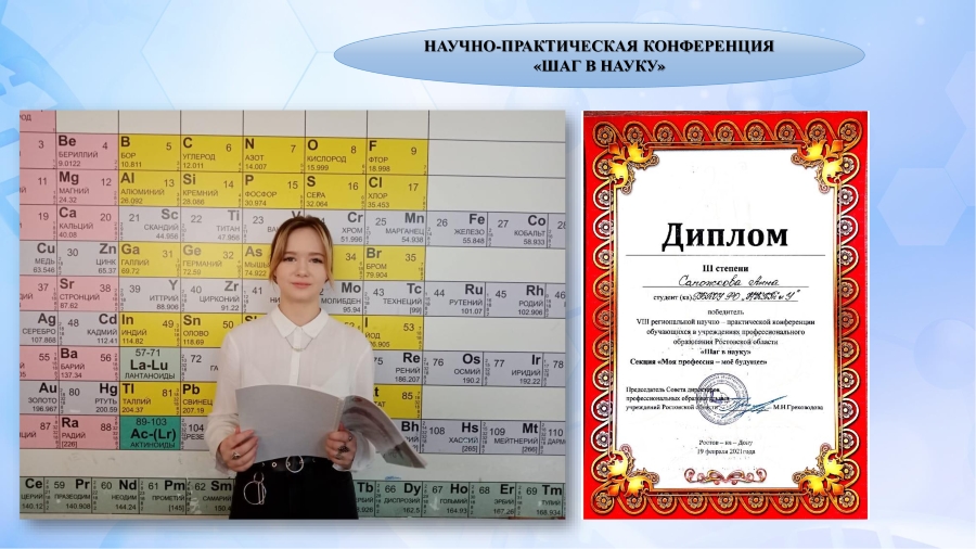 В феврале 2021 года в ГБПОУ РО «Донской техникум кулинарного искусства и бизнеса» состоялась VIII научно-практическая конференция обучающихся в учреждениях профессионального образования Ростовской области «Шаг в науку». В конференции приняли участие 26 учреждений профессионального образования Ростовской области, на суд экспертного совета были представлены 62 работы студентов.