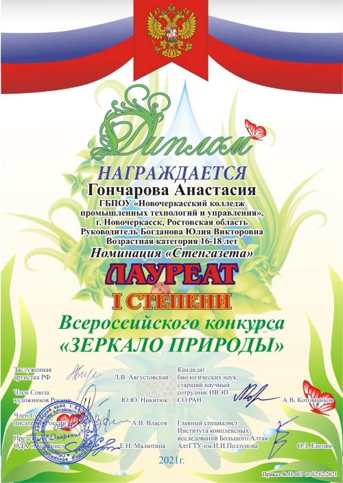 Лауреатом I степени Всероссийского конкурса «Зеркало природы» стала студентка второго курса, группы ПК-191 Гончарова Анастасия под руководством классного руководителя Богдановой Ю.В.