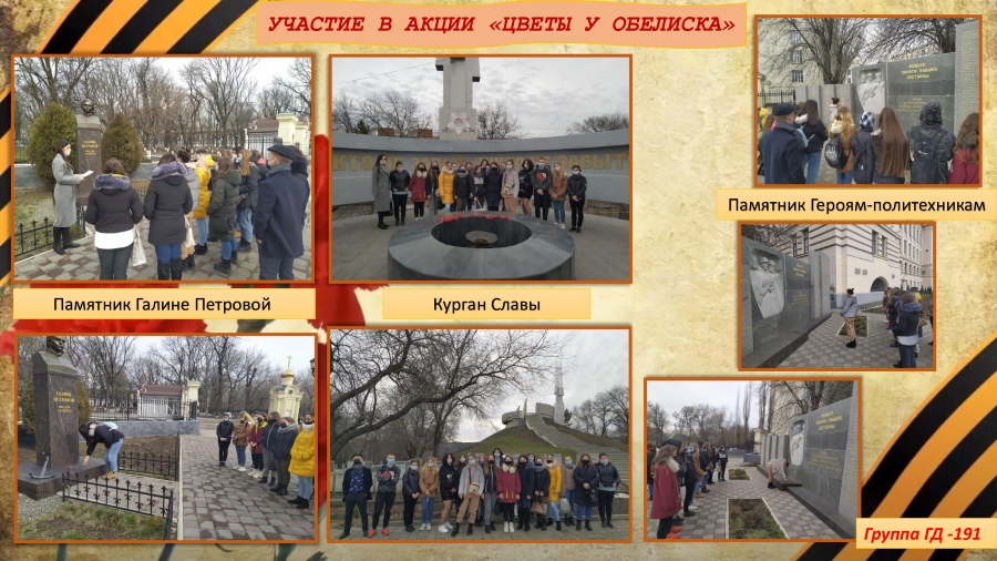 02 февраля 2021 года группа Гд-191 отделения «Сервис и туризм» под руководством классного руководителя Лавренко Н.С. приняла участие в акции «Цветы у обелиска» в рамках проведения месячника военно-патриотической и спортивной работы, посвященного Дню защитника Отечества и 76-й годовщине Победы в Великой Отечественной войне.