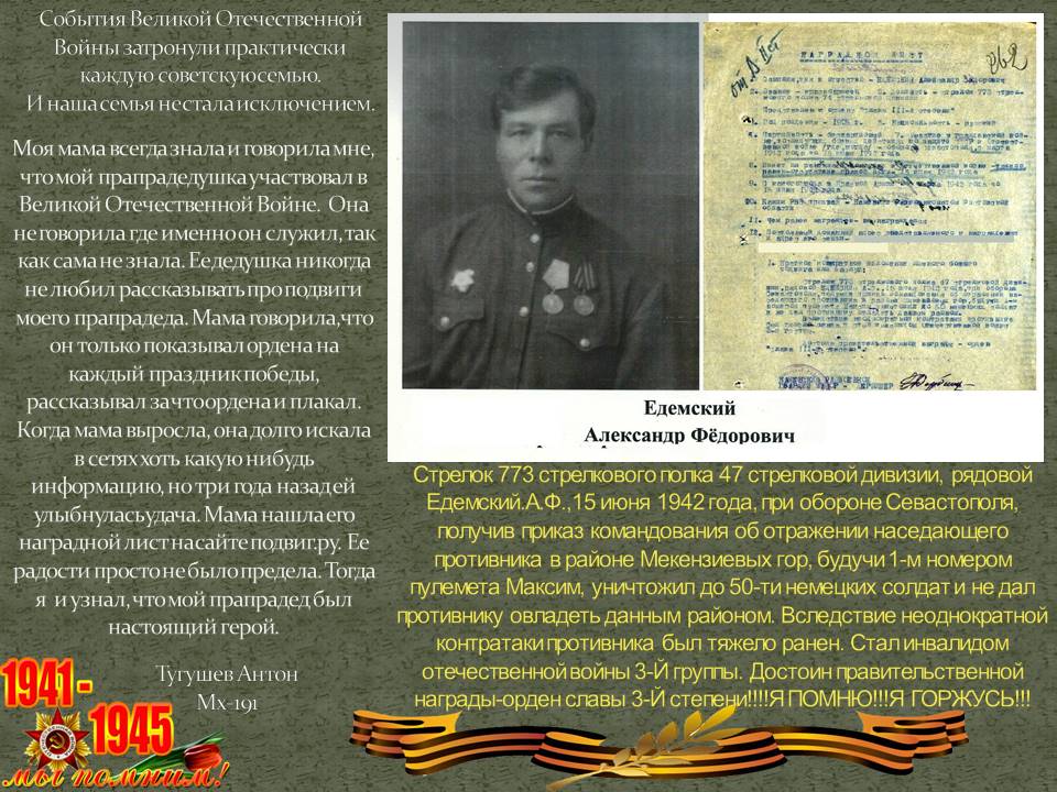 Почти 75 лет прошло со дня Великой Отечественной войны, но раны, нанесённые ею не забыты. Война коснулась практически каждую семью… Изучение подрастающим поколением корней своей семьи – богатейший ис-точник жизненного и исторического опыта. Именно поэтому ребятам первого курса преподавателем истории Прокопенко Н. П. было предложено принять участие в дистанционном Проекте Памяти «Солдат моей семь». История каждого Солдата, каждой семьи в годы войны важна, так как именно из таких историй складывается Всеобщая История – История нашего Отечества. И такая, Великая История, помогает чувствовать себя единым народом Великой страны.