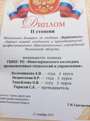 Поздравляем команду студентов и преподавателей ГБПОУ РО "Новочеркасский колледж промышленных технологий и управления" Колесникову А.В., Нецветаеву В.Р., Тануйлову О.В., Тарасова Сергея Алексеевича, Юдину Ольгу Николаевну с победой в Областном конкурсе по геодезии "Вертикаль"!