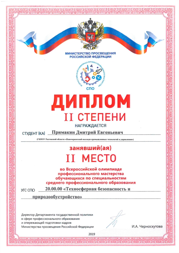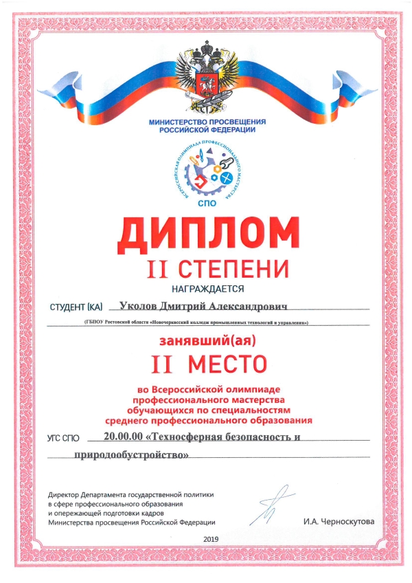 Команда ГБПОУ РО «Новочеркасский колледж промышленных технологий и управления» в составе Примакин Дмитрий, Шатравин Дмитрий, Уколов Дмитрий, Настис Павел под руководством преподавателя Плечикова Д.С. заняла 2 место в Заключительном этапе Всероссийской олимпиады профессионального мастерства обучающихся по Укрупненной группе специальностей среднего профессионального образования 20.00.00 Техносферная безопасность и природообустройство, которая проходила с 15 по 17 мая 2019 года в г. Ижевске на базе Автономной некоммерческой профессиональной образовательной организации «Колледж государственной и муниципальной службы».