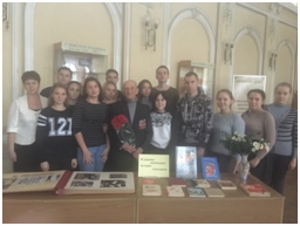 26 октября студенты группы ЗИО-173 (кл. руководитель Ю.В.Чумаков) приняли участие во встрече и диалоге поколений под общим названием «На то нам молодость дана», посвященной 100-летию ВЛКСМ, которая проходила в читальном зале городской библиотеки им. А.С.Пушкина. Ребята общались с комсомольцами разных периодов развития нашей страны. Особенно запомнился рассказ участника Великой Отечественной войны, участника Первого Парада Победы на Красной площади, Почетного гражданина города Новочеркасска, ровесника ВЛКСМ Б.Н.Туманова. Студенты представили презентацию на тему «Никто из нас не является началом, мы все – продолжение…» ( рук. Г.А. Акимова, Е.В.Иванова), основная мысль которой – мы - не другие, мы – просто, разные. От имени колледжа Б.Н.Туманову были вручены цветы, памятные фотографии, видеофильм «Я помню, я горжусь, я живу…..» о встречах на площадках нашего учебного заведения.