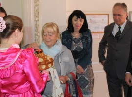 По русскому обычаю иностранных гостей встретили с хлебом и солью.